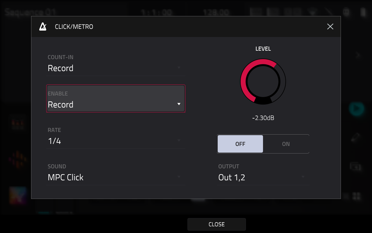 The output field will select the outputs this audio is sent to (useful for if you want to keep the metronome separate from the main mix, for example when sending to a monitor mix for a live performance). Please note, this is dependent on the output pairs available on your MPC.