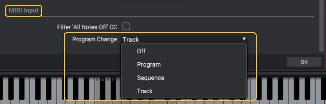 3. In the MIDI / Sync window, scroll down to the MIDI Input section. Expand the Program Change dropdown menu and choose the area of MPC Beats you want to control using your pads.