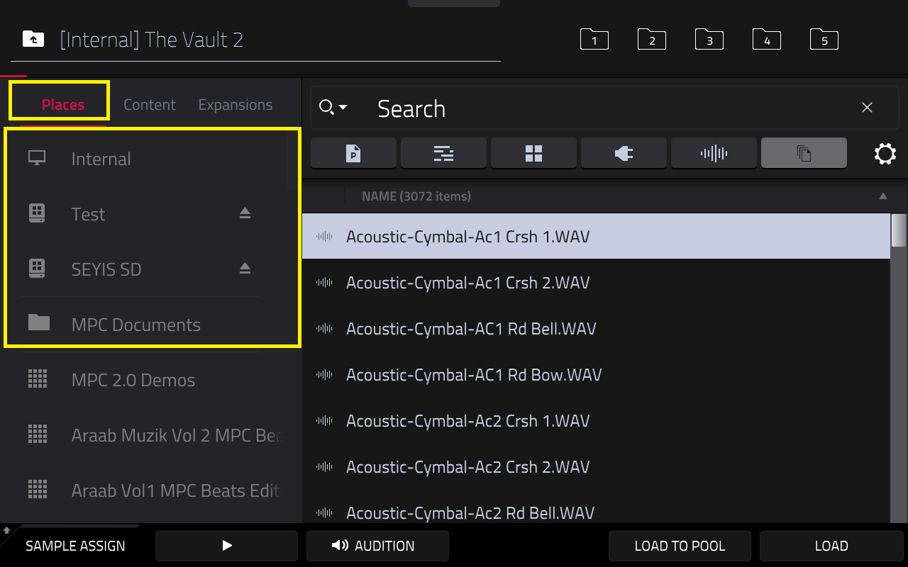 To get the most efficient use of the Browser, set the file paths to your favorite drive locations first. There are five folder buttons labelled 1–5 in the upper-right corner. You can set these to be shortcuts to five locations on your MPC hardware’s internal drive and/or any connected storage devices, giving you quick access to your files.