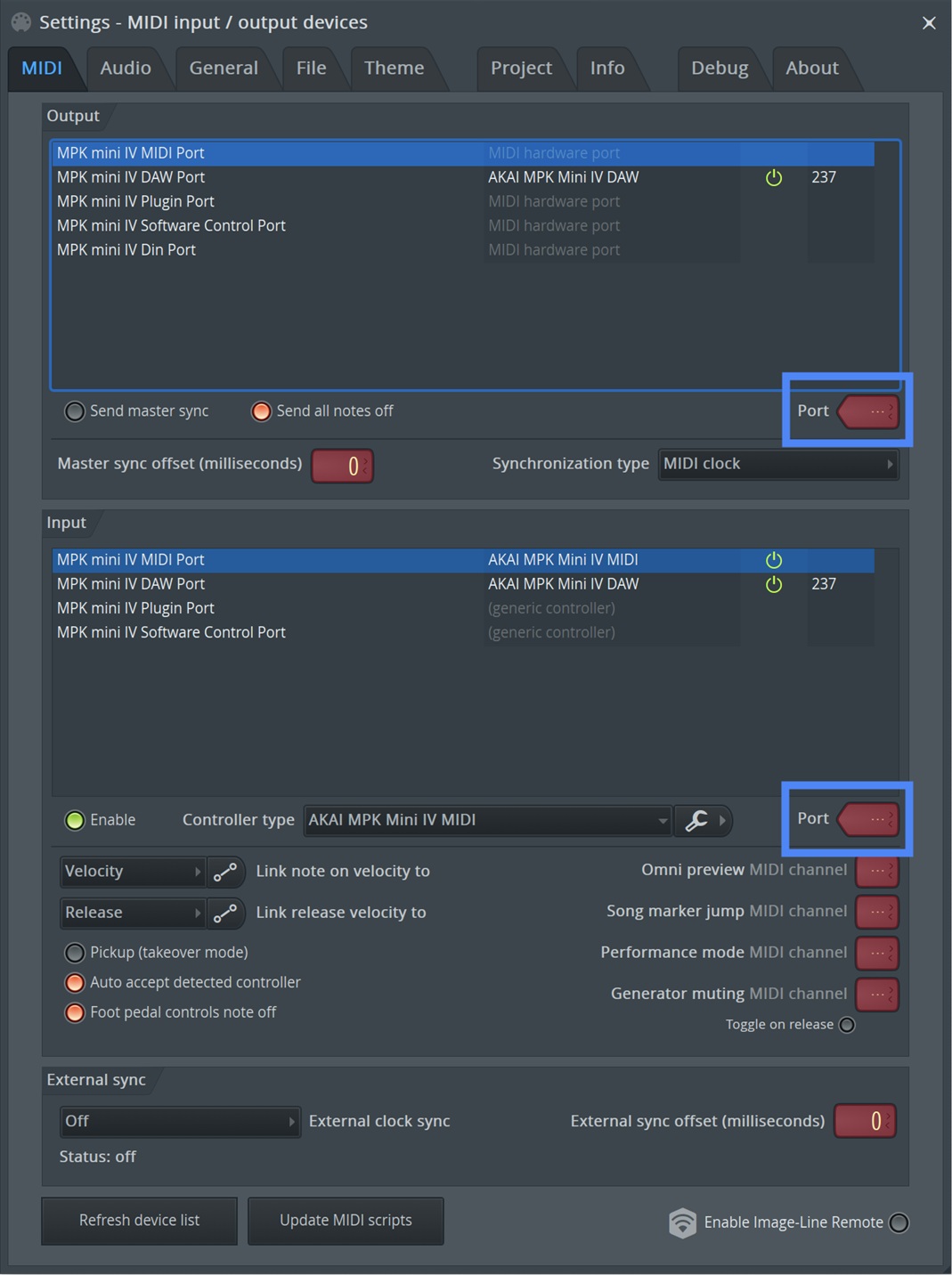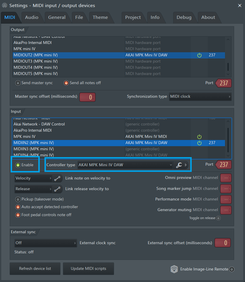 - Select the MPK mini IV MIDI input and enable as a controller by clicking Enable. Make sure that the Controller type dropdown menu is set to AKAI MPK Mini IV MIDI.
