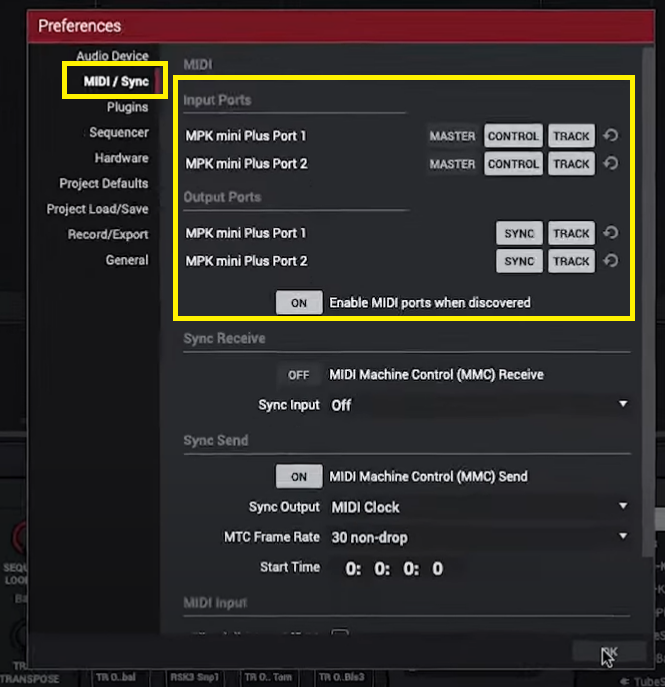2. Click on the MIDI / Sync tab, and configure the MIDI ports as seen below: