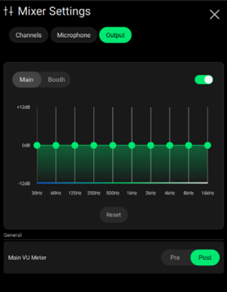 In this tab, you can apply and adjust EQ curves for the Main and Booth outputs.