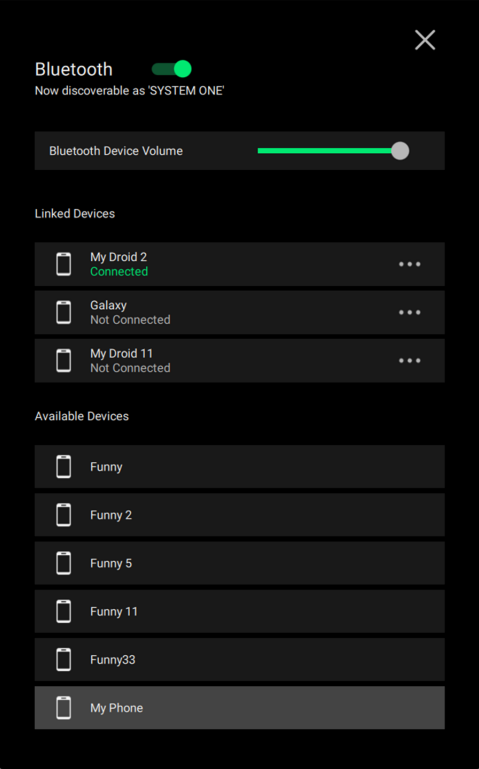 - Select your device from the list of Available Devices. The first time you connect a device, you will be prompted with a passcode to confirm on both SYSTEM ONE and the Bluetooth device. Alternatively, for audio input devices such as smartphones or tablets, navigate to the Bluetooth Settings screen on your device. Then, locate SYSTEM ONE and select it.
