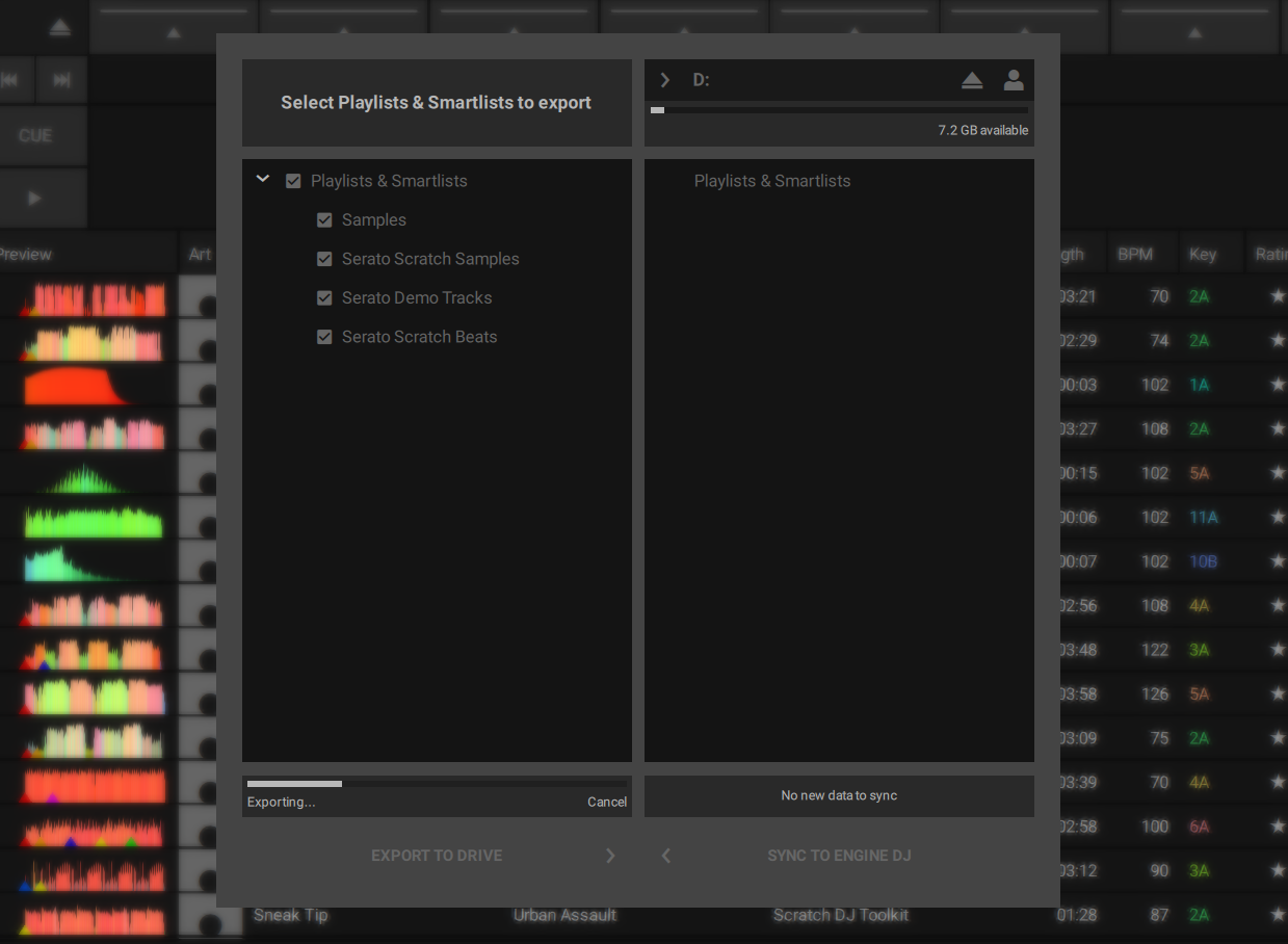 You will then see a progress bar indicating the export status of your Playlists. Export times will vary depending on the size of your library, file format, speed of your storage device, etc. so plan to do this when you have ample time available. Some users opt to let their library analyze files or perform large exports while they are away from their computer. We suggest this method for users with extensive libraries.