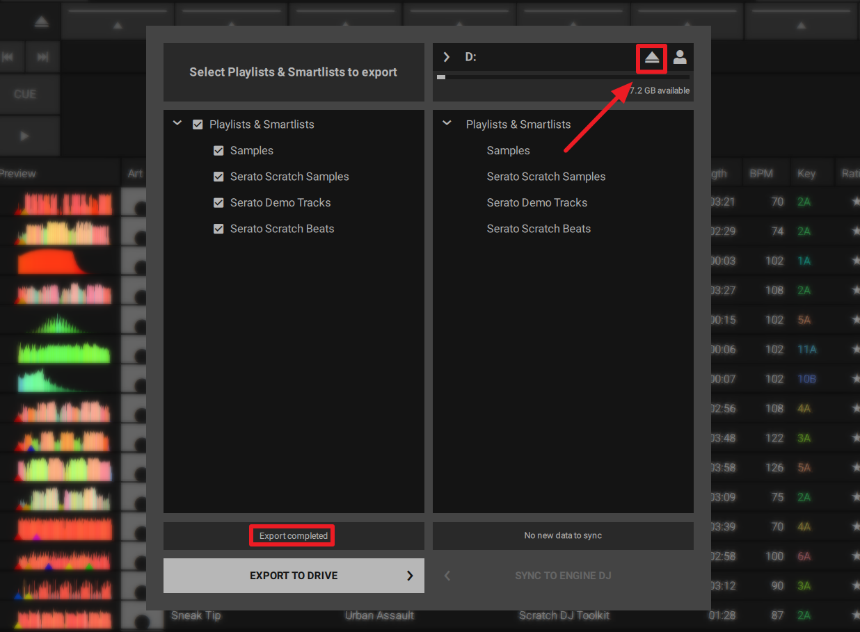 Once finished, the SYNC MANAGER window will show Export completed. You can now safely remove your storage device using the Eject button.