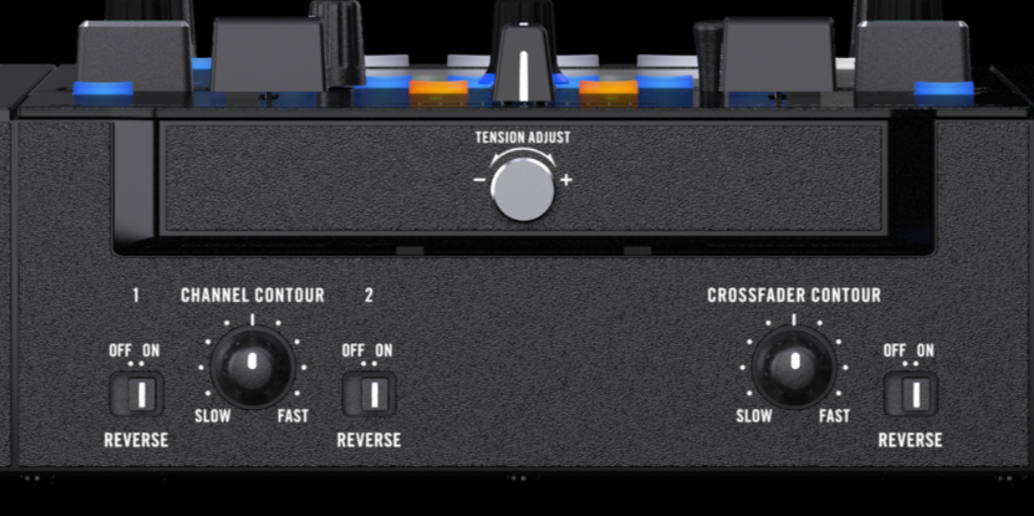 Crossfader Contour - Adjusts the slope of the crossfader curve. Turn the knob to the left for a slow smooth fade (mixing) or to the right for a fast sharp cut (scratching). The center position is a typical setting for club performances.