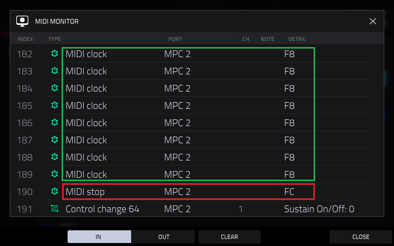 MMC / MIDI クロックを使用して MPC がPlay (F8) とStop (FC) を受信する例をご覧ください: