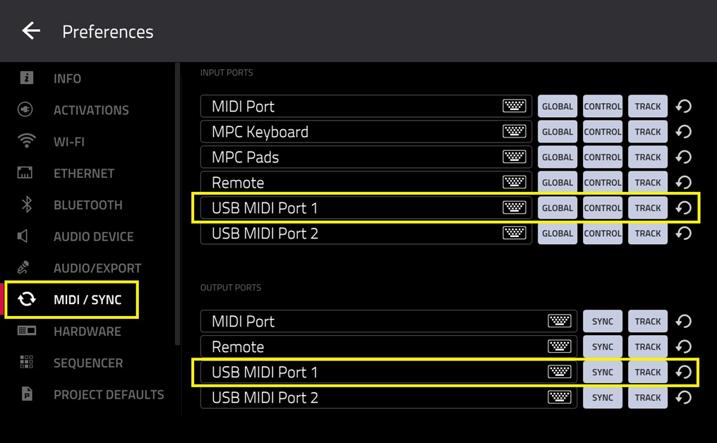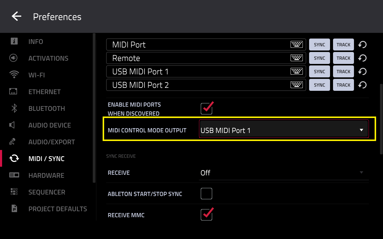 2. Menu > Preferences > MIDI / Sync に進み、以下に設定します。