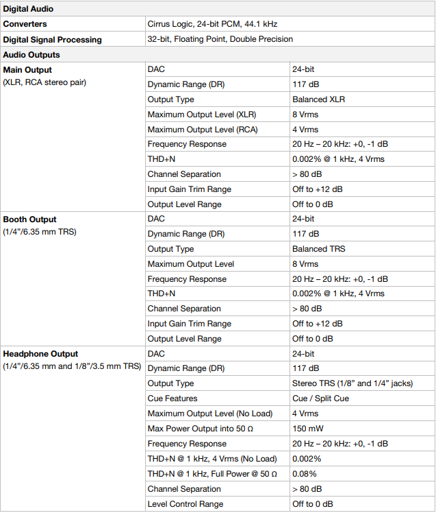 ブース出力(1/4インチ / 6.35 mm):標準のRCAケーブルを使用して、これらの出力をブースモニターまたはブースアンプシステムに接続します。トップパネルのブースノブで音量を調整します。