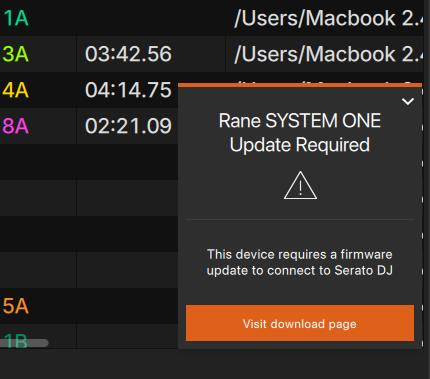 Rane SYSTEM ONEをアップデートする前にSerato DJ Proをアップデートすると、コンピューターの画面の右下に以下のメッセージが表示されます。