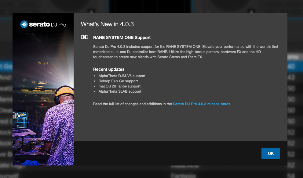 Serato DJ Pro 4.0.3を初めて起動すると、以下のオンボーディングメッセージが表示されます。「OK」をクリックして続行してください。