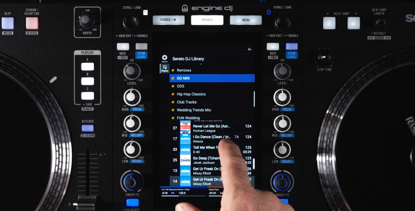 コンピューターから各バーチャルデッキにトラックをロードすれば、Rane SYSTEM ONEでライブラリ内を移動し、タッチスクリーンまたは各デッキ専用のハードウェアコントロールを使ってトラックをロードできます。