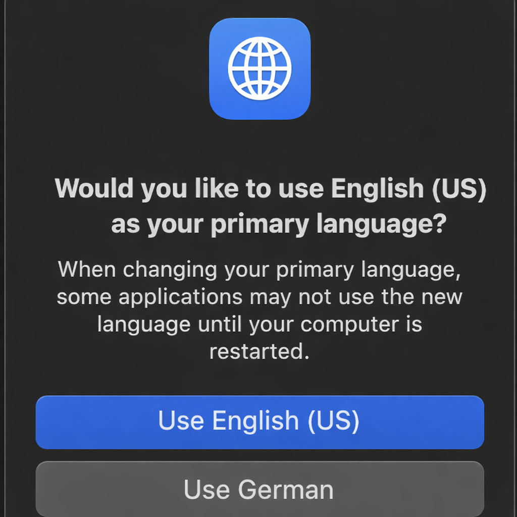 上記のメッセージが表示されても、Rane SYSTEM ONEがMacコンピューターに接続されない場合は、macOSの入力言語を英語以外に設定しているエンドユーザー特有の現象であると考えられます。社内で英語から別の言語への切り替えテストを行ったところ、この問題が再現されました。