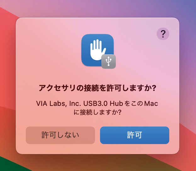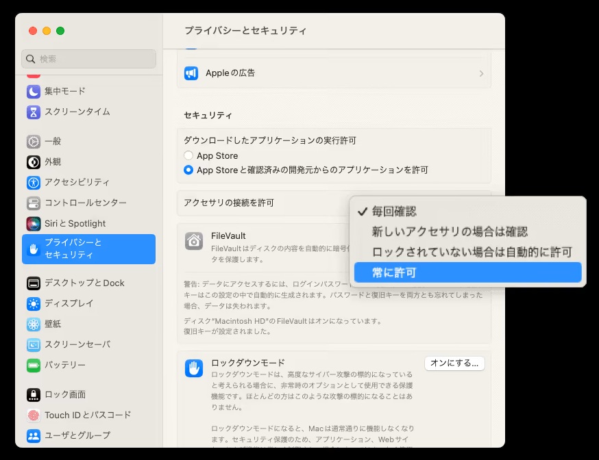上記のプロンプトを「許可しない」を選択して閉じた場合は、「システム設定」>「プライバシーとセキュリティ」>「アクセサリ」に移動して「常に許可」に設定することで変更できます。